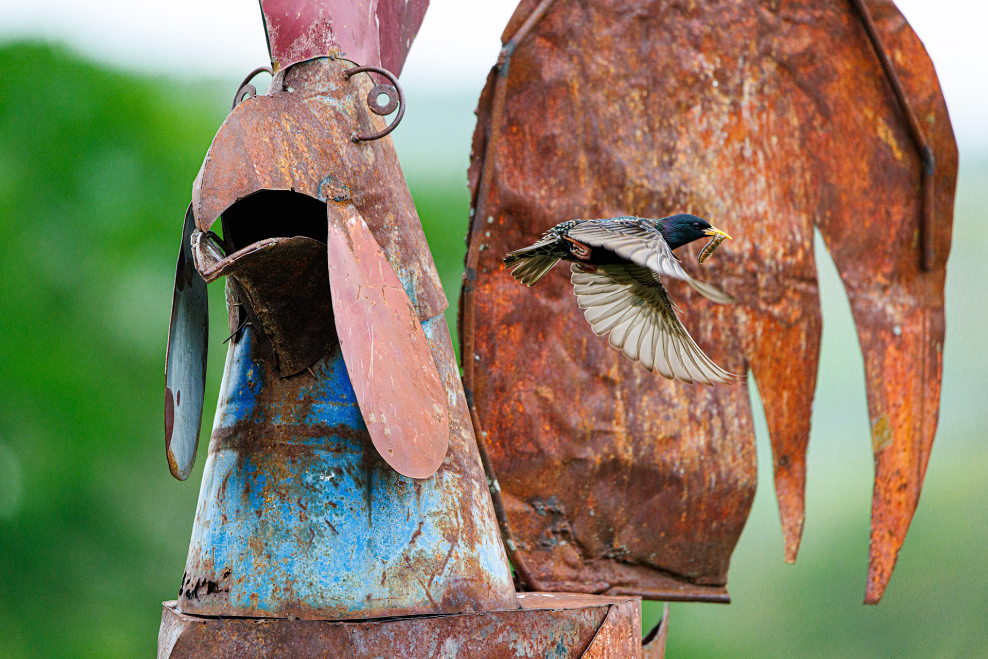 This Starling has a nest in the mouth of this metal rooster! Love how this one turned out.