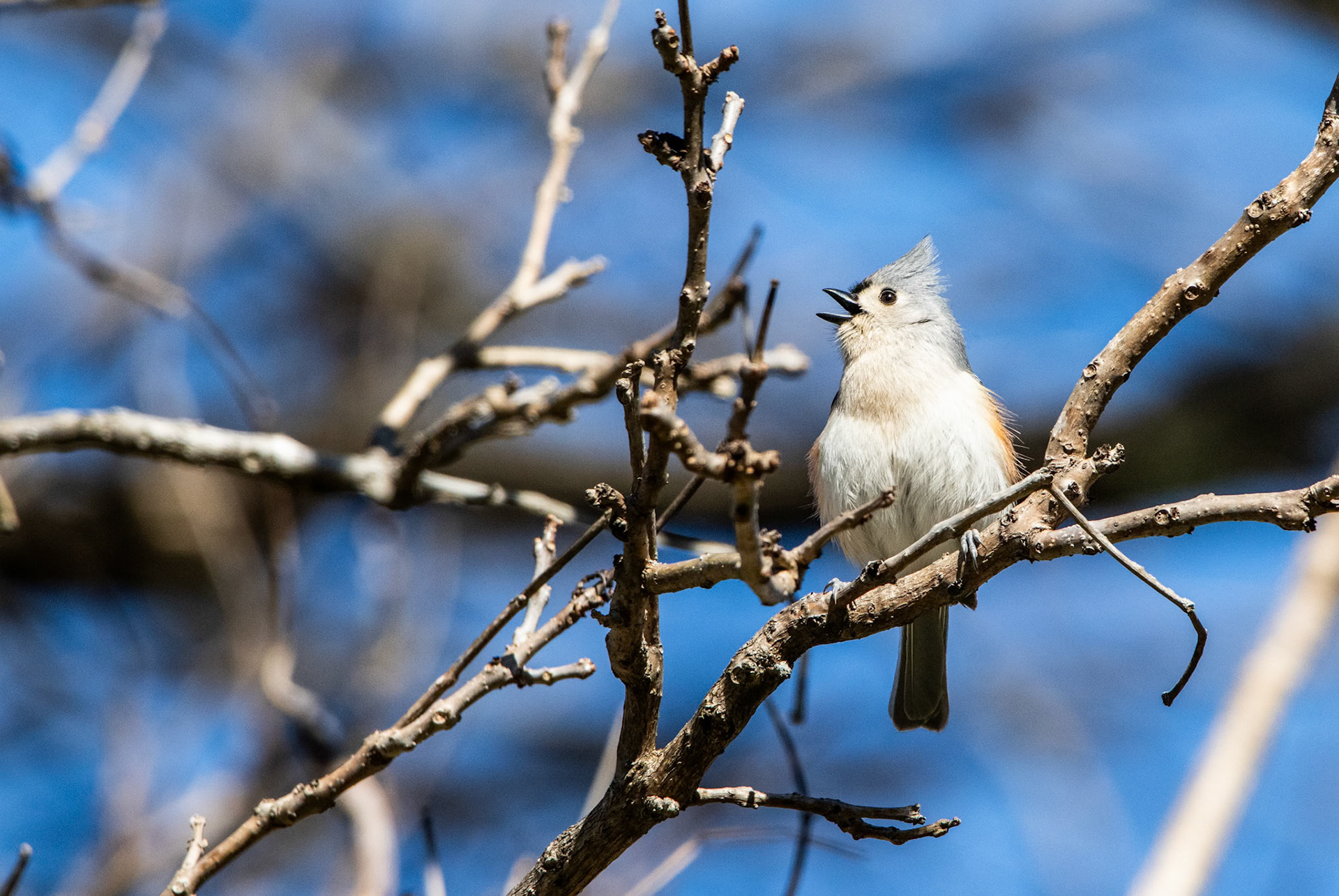 Cute little Tufted Titmouse all puffed up in the cold weather